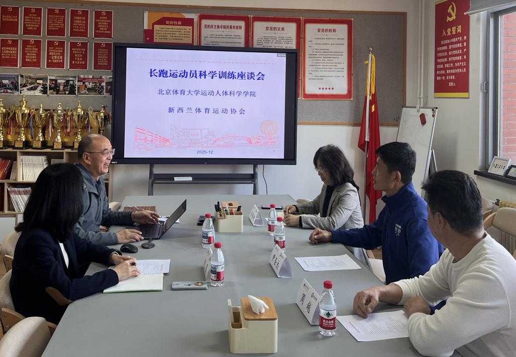 2025年12月5日11时,新西兰体育运动协会高级教练、协会训练基地跑团负责人尹圣杰到访我院,学院分党委书记许寿生、副院长赵星,“一带一路”冰雪运动重点实验室主任周越,运动营养研究工程中心副主任许春艳在306会议室与来宾围绕“长跑运动员科学训练”展开热烈讨论,寻找合作契点。