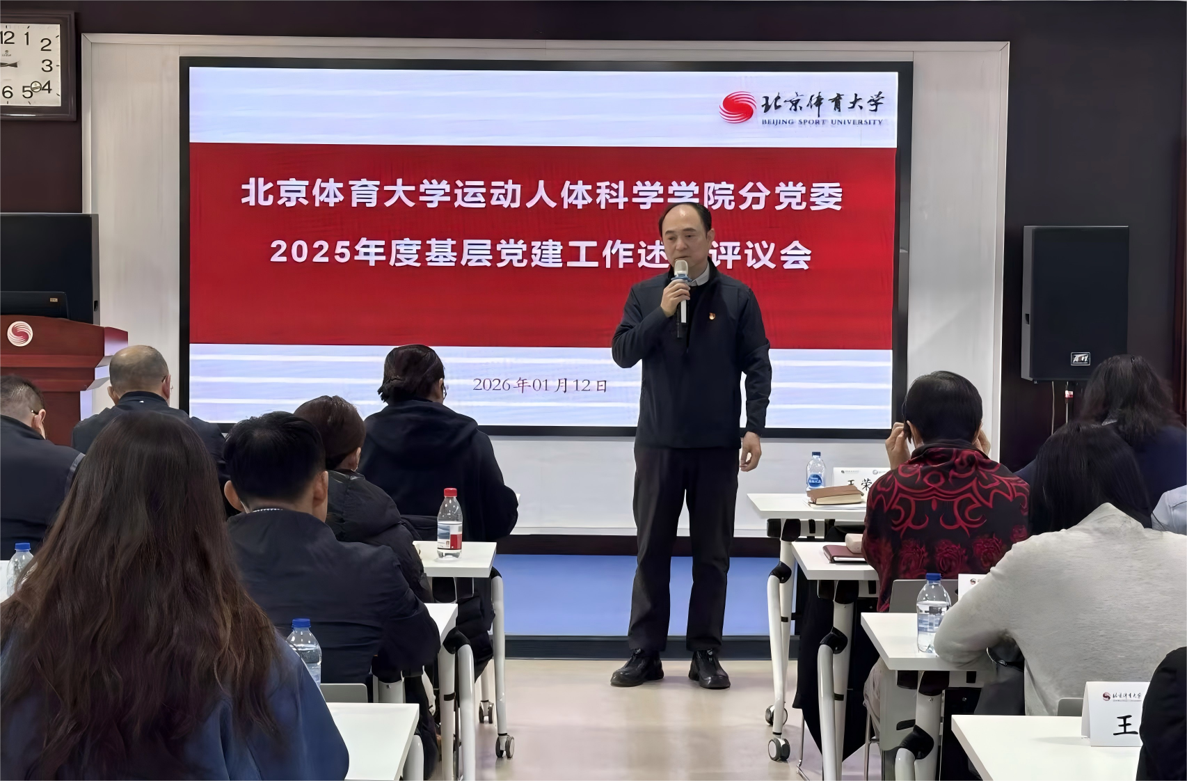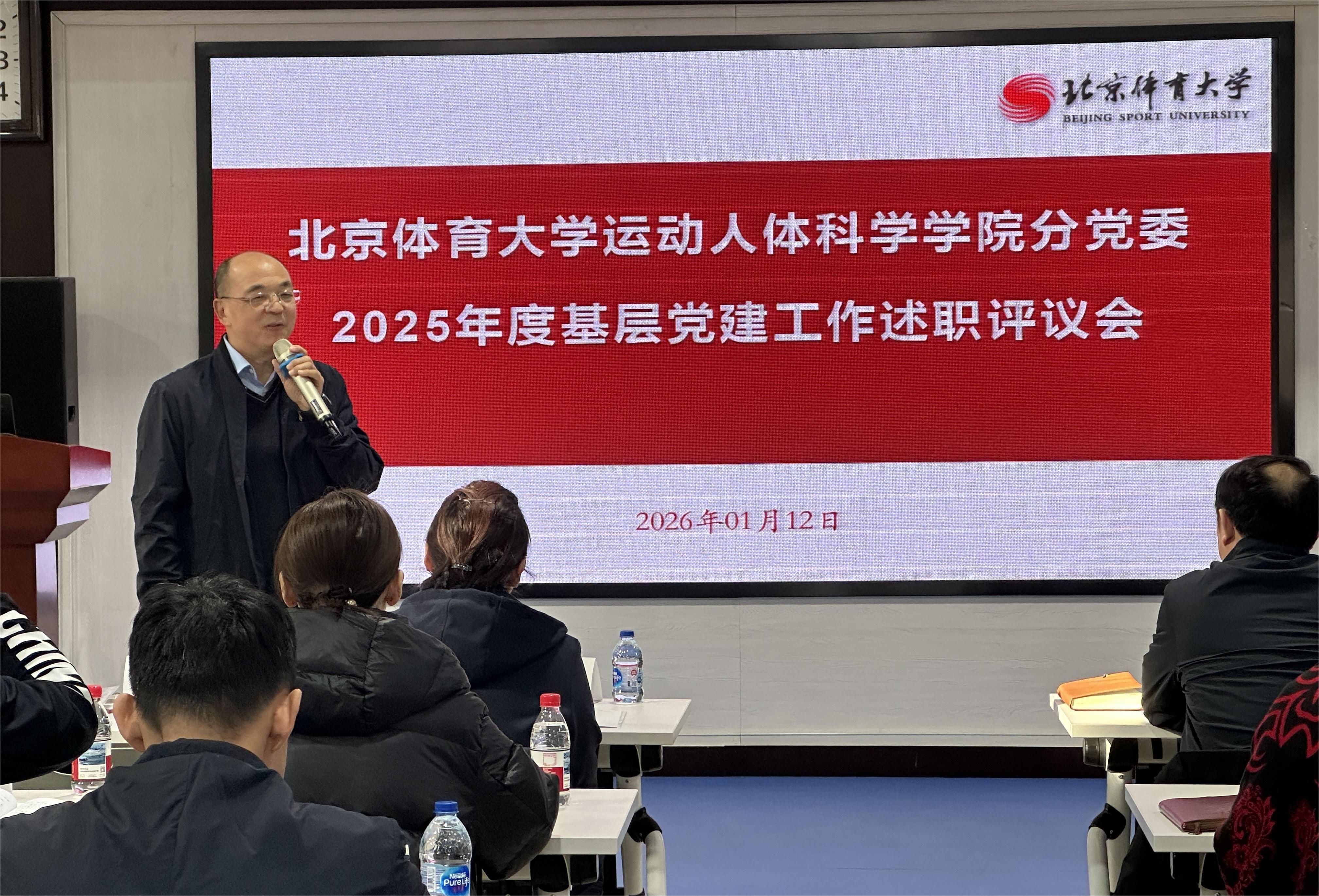 为深入学习贯彻习近平新时代中国特色社会主义思想和党的二十大、二十届四中全会精神,全面落实新时代党的建设总要求,根据北京体育大学《关于做好2025年度基层党组织书记党建述职评议考核工作的通知》要求,2026年1月12日,运动人体科学学院分党委在教学实验楼322召开2025年度党支部书记抓基层党建述职评议会。北京体育大学党委常委、学校第九指导组组长王荣辉副校长、第九指导组成员党委统战部常务副部长李荷、学校机关党委赵岩莅临指导工作。运动人体科学学院分党委书记许寿生,分党委副书记、院长刘卉,分党委委员、副院长赵星,副院长周财亮,以及分党委委员吴晓薇、专职组织员杨丹、各党支部书记和师生代表海淀区政协委员李红娟教授、单威老师、卞亦瑄老师、厉芷扬老师及学生代表王昊南等近30人参加会议。会议由许寿生主持。
