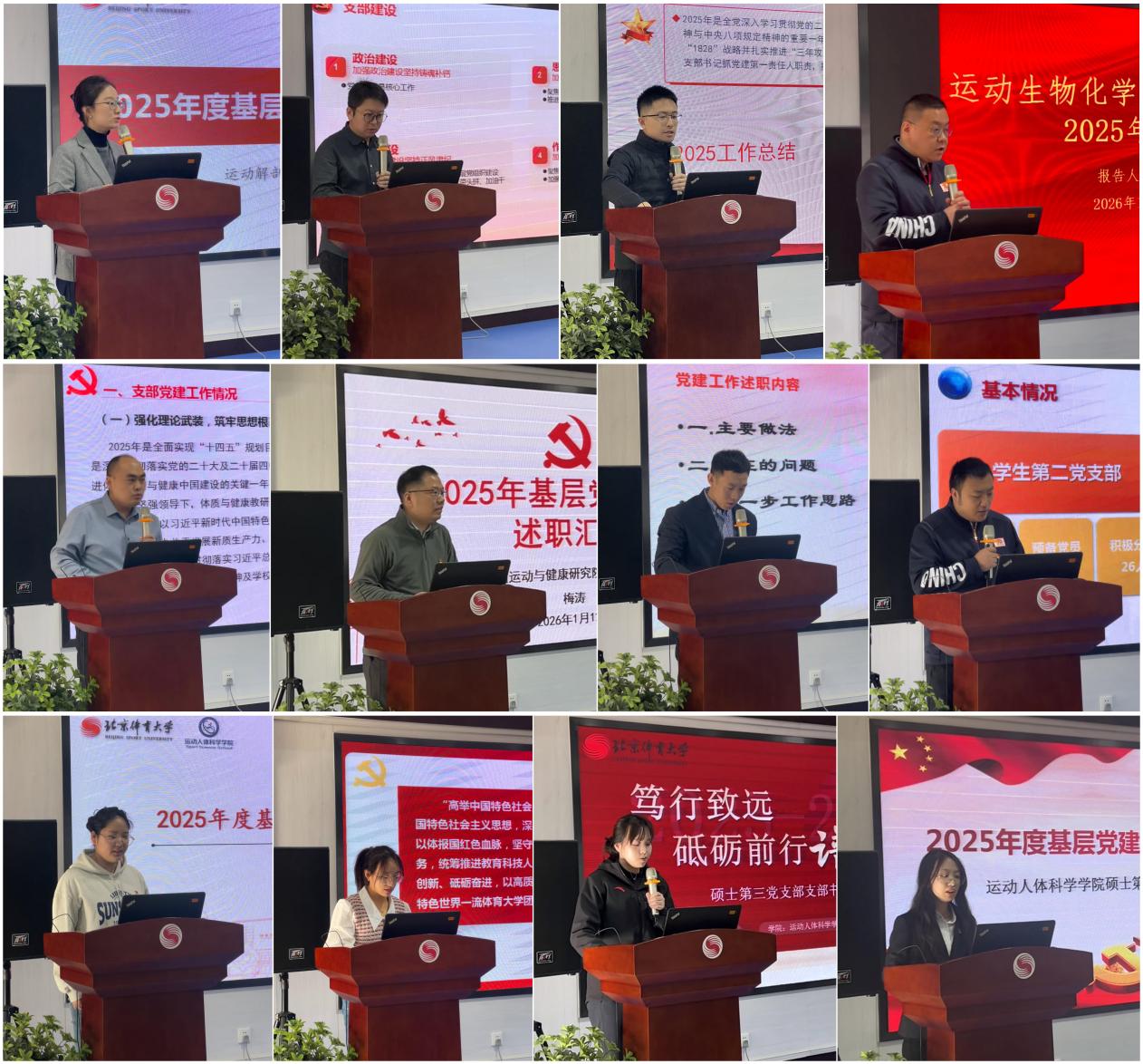 会上,12位党支部书记屈莎、吴迎、万祥林、苏浩、张留伟、梅涛、娄立天、刘鸿瑞、胡慧、白紫菲、童晟莹、朱佳依次作述职汇报。各位党支部书记立足抓党建第一责任人职责,全面梳理2025年度履职情况与工作成效:一是深化理论武装铸魂,持续推进习近平新时代中国特色社会主义思想系统学习,深入学习贯彻党的二十届四中全会精神,落实学校第十三次党代会精神,扎实开展中央八项规定精神学习教育,切实把学习成果转化为推动工作的实际动力;二是抓实组织建设强基,严格规范"三会一课"、主题党日、组织生活会等组织生活制度,精准推进党员发展、教育、管理全流程工作,不断提升支部组织力、凝聚力、战斗力;三是推动党建业务融合赋能,紧扣北京体育大学"双一流"建设目标和学院学科发展定位,将党建工作与教学科研、人才培养、全民健身服务等中心工作深度融合,在运动人体科学研究、体育人才培育等领域彰显党建引领作用。