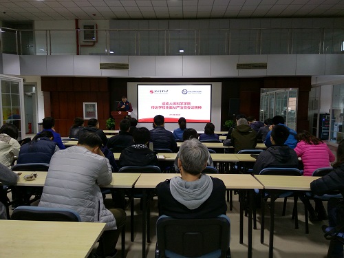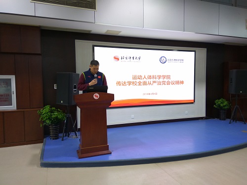 2018年4月4日中午,运动人体科学学院在教学实验楼322实验室召开了全体教职工大会,传达学校2018年全面从严治党工作会议精神。会议由学院分党委书记苍海主持。