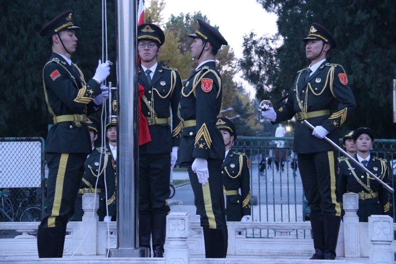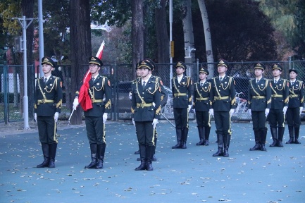 活动伊始,北京体育大学国旗护卫队肩扛国旗,迈着坚定的步伐,向着升旗台走来。全体师生整齐列队,庄严肃立,共唱国歌并行注目礼。